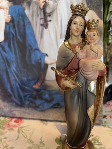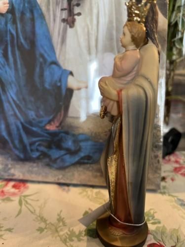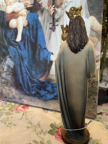 優しいまなざしのマリアさまと、幼子イエスさまが寄り添う美しい聖母子像。 金の王冠とマントの装飾が丁寧に彩色され、祈りの空間にふさわしい気品があります。 手にされた聖具、イエスさまの穏やかな表情―― どれも信仰者の心をそっと励まし、見守ってくださるような佇まいです。 ・卓上祭壇、玄関や寝室にも飾りやすいサイズ ・軽量で扱いやすいレジン製 ・柔らかく温かな彩色 高さ20cm × 幅5cm